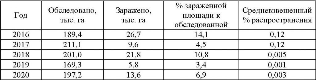 В 2020 году ржавчина выявлена на 23% обследуемой площади, что в 2,3 раза меньше, чем в 2019 году, этому способствовали засушливые условия и проведение профилактических фунгицидных обработок. В 2021 году в связи с невысокой инфекционной нагрузкой развитие и распространение ржавчины на горохе будут на среднемноголетнем уровне. Интенсивность развития болезни будет зависеть от погодных условий, наличия зараженных растительных остатков и засоренности молочаем. Снизить инфекционную нагрузку позволит соблюдение севооборота, агротехнические мероприятия (уничтожение молочая – промежуточного хозяина ржавчины гороха).