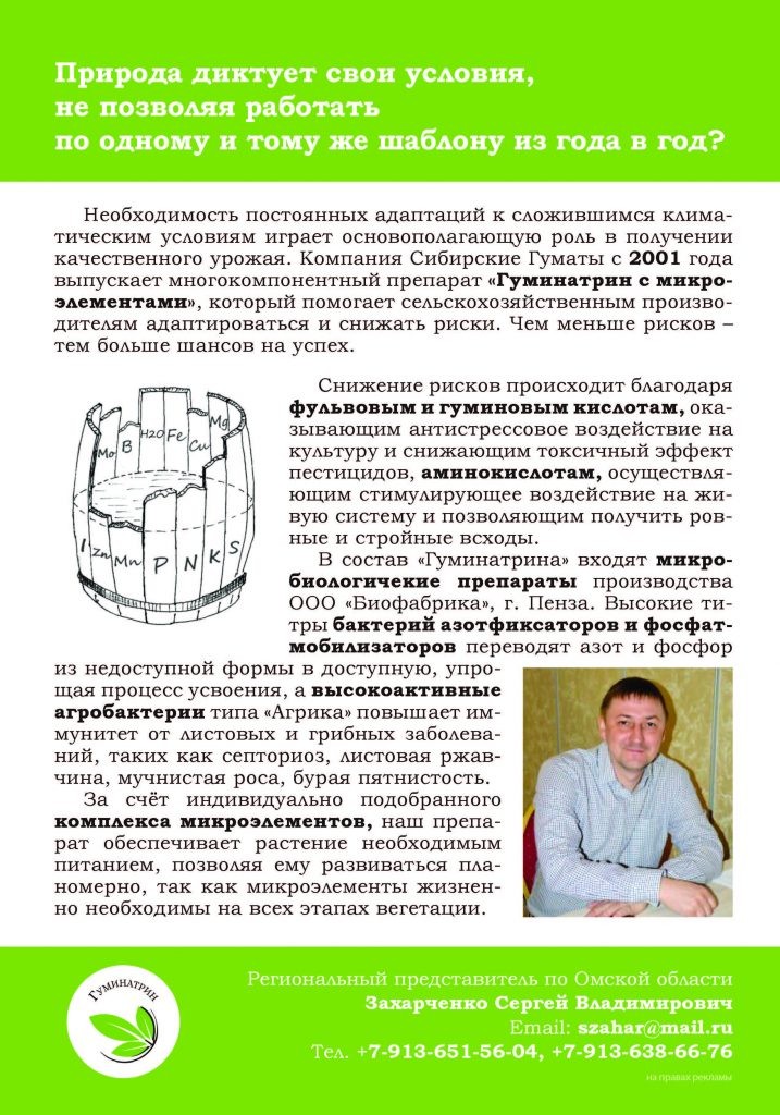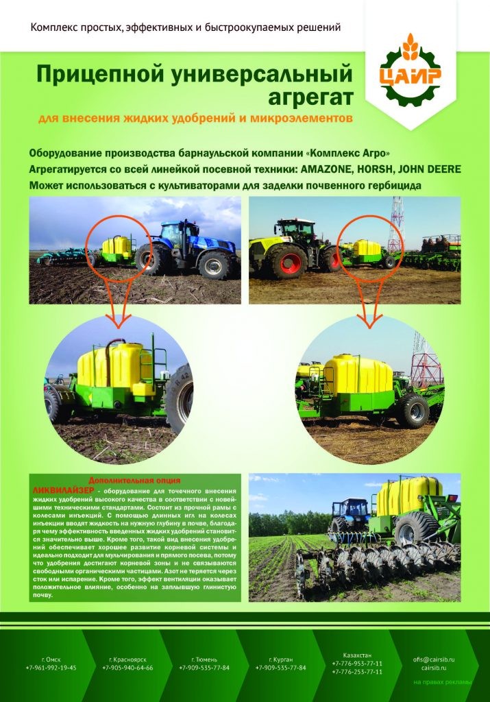 «Комплекс Агро» также предлагает технические решения для внесения жидких удобрений с микроэлементами. В ряде хозяйств Алтайского края и Новосибирской области проходят полевые опыты. Повышение урожайности зафиксировано – на 25-45%, снижение себестоимости – на 20-30%.