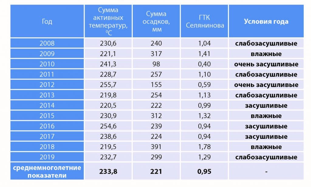 Для оценки влагообеспеченности в разные годы использовали гидротермический коэффициент Селянинова (ГТК): ГТК 1,6-1,3 – влажная зона; 1,3-1,0 – слабозасушливая; 1,0-0,7 – засушливая; 0,7-0,4 – очень засушливая; менее 0,4 – сухая.
