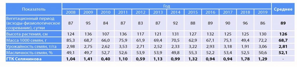 Таблица 2 – Хозяйственно ценные показатели подсолнечника сорта Иртыш за период 2008-2019 гг.
